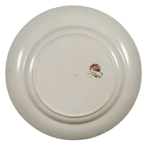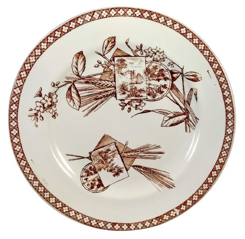 Plate, 8.5 inches diameter. Brown transfer. Printed maker's mark for F. J. Emery. "Pekin" features rectangular and round cartouches containing flowers, a canoe on water, and a ruined abbey. Sprays of wheat and flowers are found behind the cartouches. The border consists of repeated, stylized flowerheads.