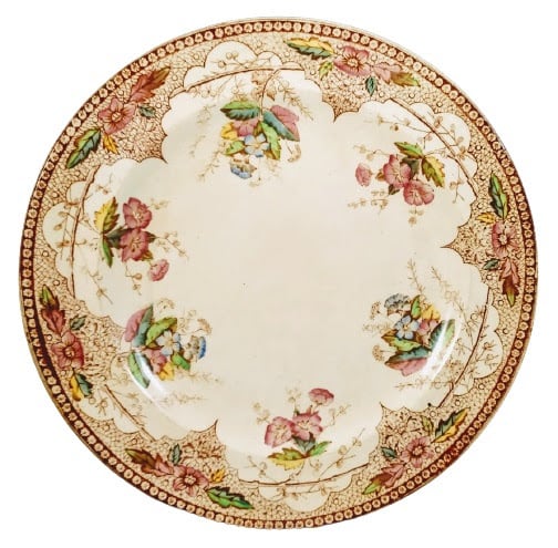 Plate, 7.375 inches diameter. Brown transfer with polychrome clobbering. Printed makers mark for Forester & Hulme. The Rd. number dates the registration of this pattern to 1889. This floral pattern features scalloped arches around the rim with the negative spaces infilled with a base sheet crackle pattern with circles and a single stylized flower with four leaves between each arch. There is an illusion of a circular thorny branch running behind the pointed bases of each arch with sprigs of flowers and foliage with berries trailing down into the well under the apex of each arch. The border consists of a thin band of repeated stylized flowers.
