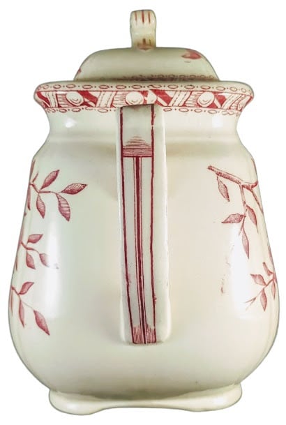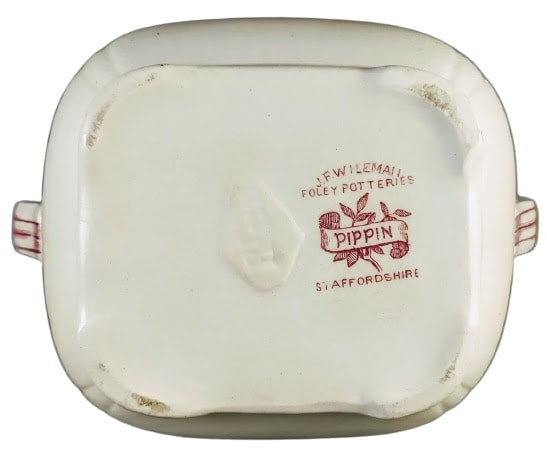 Sugar bowl, red transfer. Printed maker's mark for J. F. Wileman. The impressed diamond shape registry is illegible. This pattern, as the name "Pippin" suggests, features a branch of apples on either side. The lid features a smaller branch with apples along both long sides. The lid and body handles are decorated with simple lines. The border around the body and lid rims features a band with a repeating geometric motif consisting of circles, horizontal and diagonal lines, bordered on top and bottom with pointed ovals.