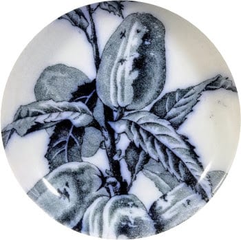 Bowl, 5.5 inches diameter (14cm). Blue transfer. Printed and impressed maker's marks for Brown-Westhead, Moore & Co. The impressed diamond registry for the shape is illegible, but other patterns in this series were registered 23 June 1875. The pattern likely dates to c. 1885. Like all the other patterns in the "Pomona" series, this pattern features a branch laden with fruit, here perhaps plums.