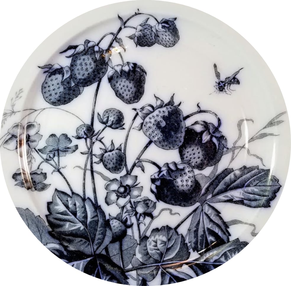 Plate, 9 inches diameter. Blue transfer. Maker is Brown-Westhead,Moore & Co. There are several marks including an impressed mark with the company name, a shield mark with Company and pattern names, and an impressed Registry diamond which is not completely readable. Other patterns in this series have a shape registration of 23 June 1875. Many of the patterns in this series were made for the French market. Grand Depot is the retailer whose mark with the name Emile Bourgeoise of Paris is also seen on the reverse. The lush strawberry plant seen includes the berries, blossoms and leaves. In addition there is a bee or wasp in flight and sprays of a common grass-like plant.