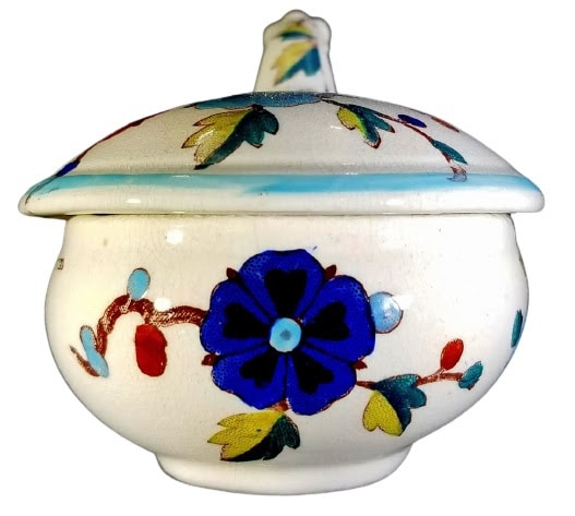 Lidded toiletry box, brown transfer with polychrome clobbering. Maker is Dunn, Bennett & Co. This lidded box was originally part of a toilet service, which was a set of objects used at the dressing table. This pattern consists of thorny hawthorn branches with flowers, buds, and leaves on all sides.