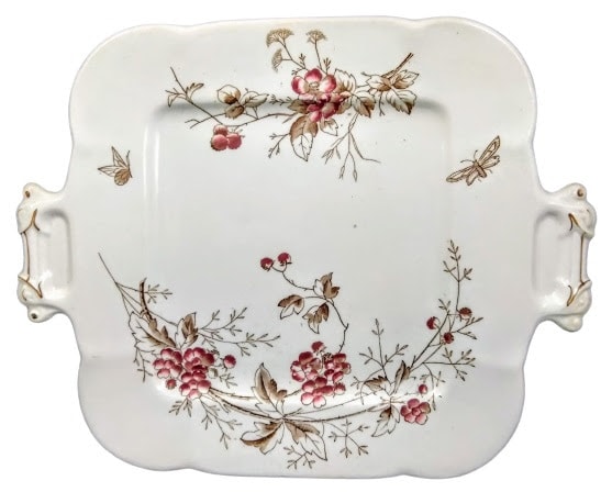 Serving plate, 11.25 x 9 inches. Brown transfer with polychrome clobbering and gilding. Printed maker's mark for Edwards Bros. The Rd. number indicates a pattern registration date of 1885. The inclusion of "England" indicates a manufacture date of c. 1891-1908. This delicate pattern features stems of five-petaled flowers mirroring each other on top and bottom edges of the plate. There is a butterfly in the empty space on the left and a moth on the right. The molded handles are decorated with gilded lines.