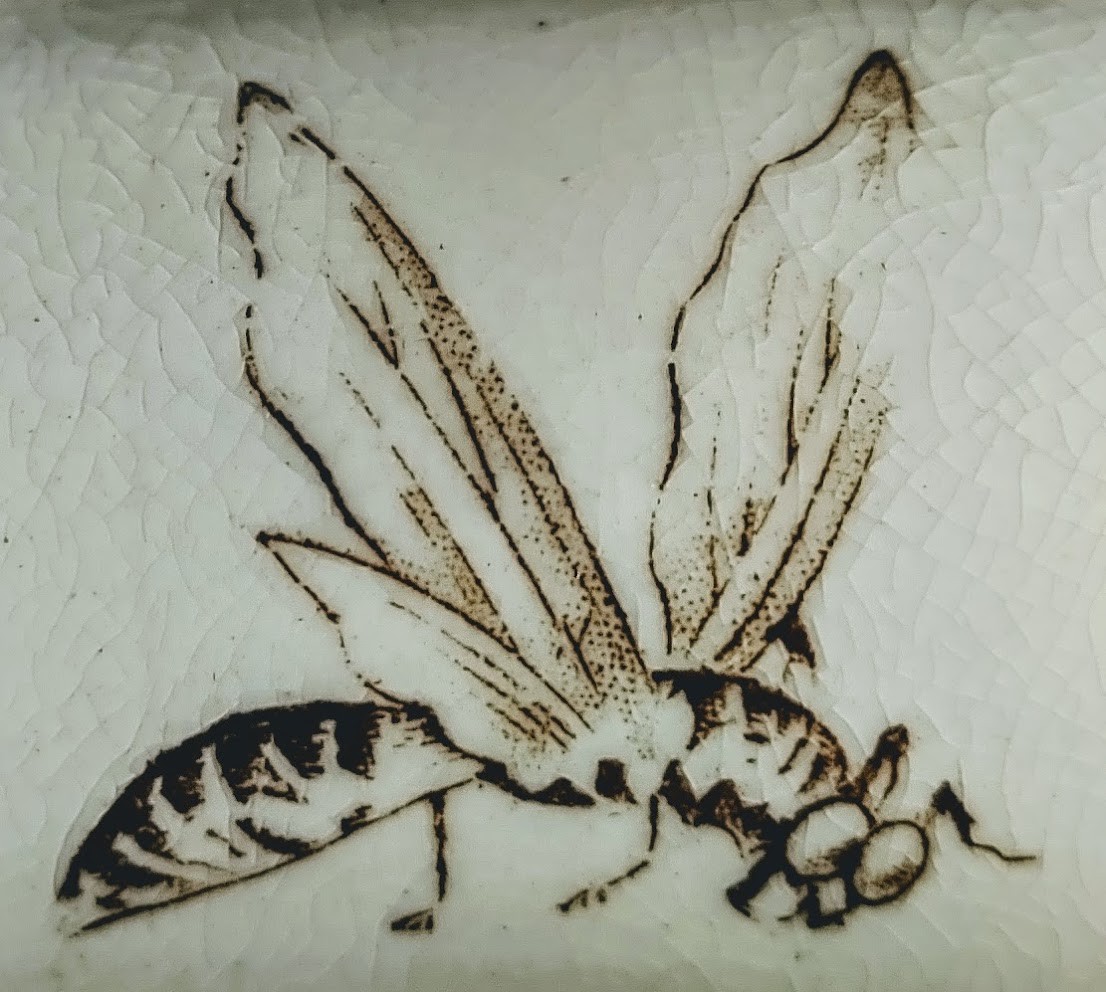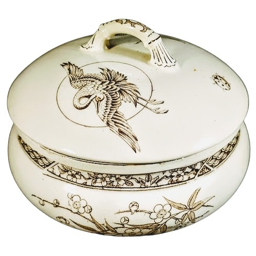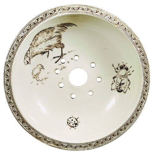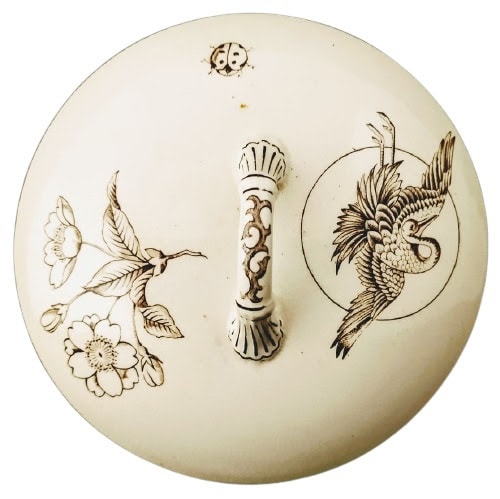 Soap dish, 5 x 4 inches. Brown transfer. Maker is Gildea & Walker. The printed registry diamond dates the registration of this pattern to 27 August 1881. This Aesthetic pattern features a disparate collection of animals and insects. The lid features a flying crane laid over a simple circle opposite a flower spray with a small ladybug between them. The insert features a chicken and her chick scratching on the ground, a large fly, and another ladybug. The border consists of a simple band with an organic-looking, scrolling line. The body of the soap dish features two flowers sprays, a wasp, and a third ladybug, evenly spaced around. The border is a band of alternating panels featuring flowers branches and the geometric fish-scale or wave pattern.