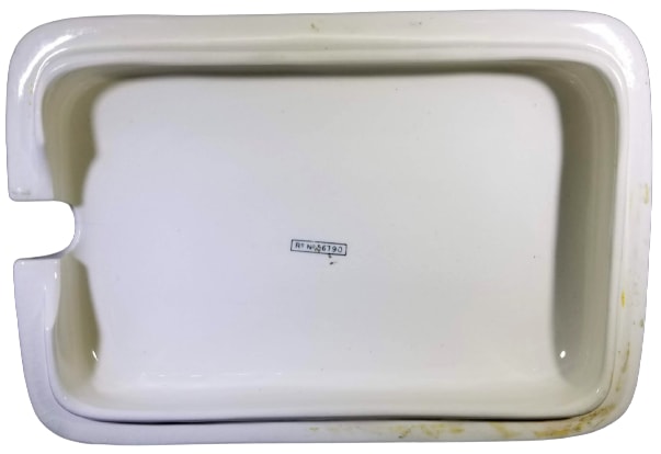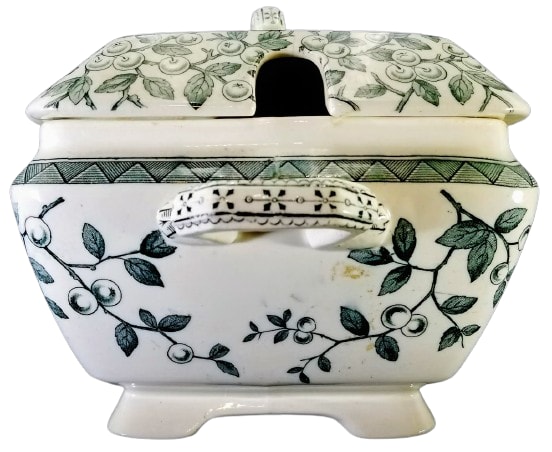 Tureen, green transfer. Maker is Burgess & Leigh. The Rd. No. indicates a pattern registration date of 1886. In the center of the pattern is a cartouche scene. The elements in the cartouche break forth from the frame and bleed out into the rest of the scene. The river which almost bisects the scene and the distant buildings alongside the river bank in the background are a carryover from the Romantic movement, suggesting that this is very much a transitional piece. Framing the picture center left is a floral display in a large, patterned clay urn that sits on a patterned shelf. Below the shelf is another cartouche space filled with one individual flower repeated in a sheet pattern. Below that is a panel consisting of images of grapes and peaches.