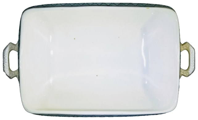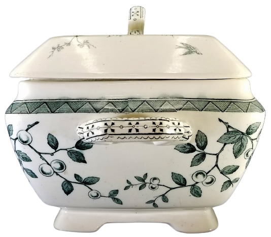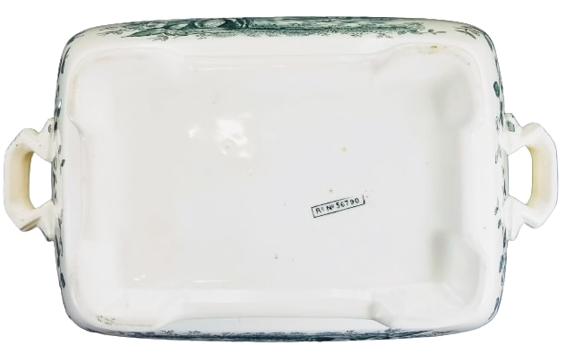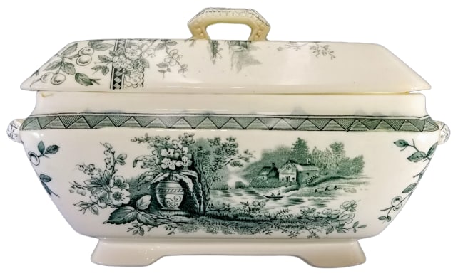 Tureen, green transfer. Maker is Burgess & Leigh. The Rd. No. indicates a pattern registration date of 1886. In the center of the pattern is a cartouche scene. The elements in the cartouche break forth from the frame and bleed out into the rest of the scene. The river which almost bisects the scene and the distant buildings alongside the river bank in the background are a carryover from the Romantic movement, suggesting that this is very much a transitional piece. Framing the picture center left is a floral display in a large, patterned clay urn that sits on a patterned shelf. Below the shelf is another cartouche space filled with one individual flower repeated in a sheet pattern. Below that is a panel consisting of images of grapes and peaches.