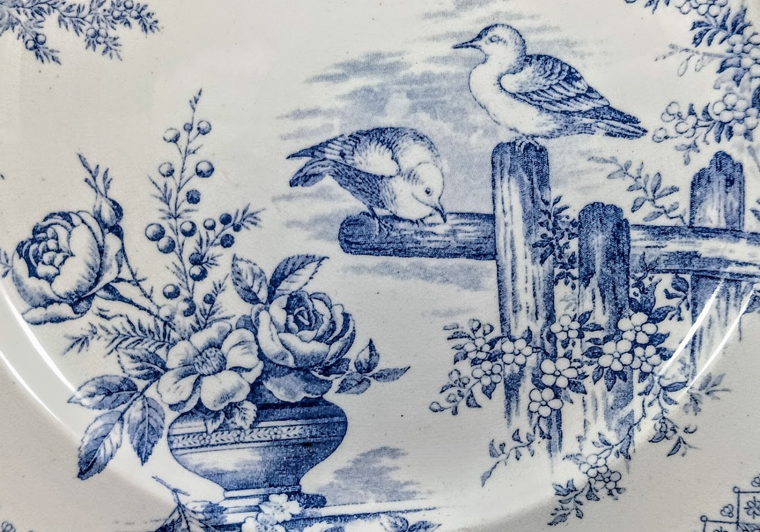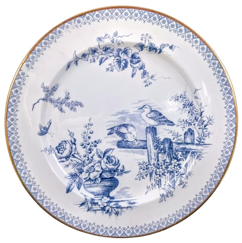 Plate, 10.5 inches diameter (26.7cm). Blue transfer with gilding. Printed maker's mark for Goode & Kenworthy. This pattern features several motifs placed around the well rim. The primary motif consists of two birds, likely doves, perched on a rustic wooden fence with a trailing flower bush. To the left is a low, squat vase filled with large rose- and peony-like flowers, foliage, and berries, with a butterfly hovering to the upper left. Above this motif is a small branch of berries jutting right into the well and at the top of the well there is a horizontal trailing vine with heart-shaped leaves and flower buds. The border consists of a repeated diamonds filled with simple, stylized flowers and bordered on top and bottom by additional stylized flowerheads. A simple gilded line completes the border.