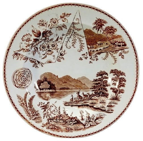 Plate, 10.75 inches diameter. Brown transfer. Printed maker's mark for the Campbellfield Pottery Co. Ltd. This pattern seems to include a little bit of everything. In the center a family of deer, standing on a jut out section of land, look out over the lake with mountains in the background that are reflected in the lake. At the top we see a sharp point which defines the edges of two cartouches in the shape of papers. Each paper has a different scene: one a mountain with trees, the other a floral spray. Ferns and unusual plants on a small piece of land on the edge of a lake complete the bottom pattern with a singing bird sitting on a bush. Off to the left is a small round geometric cartouche.
