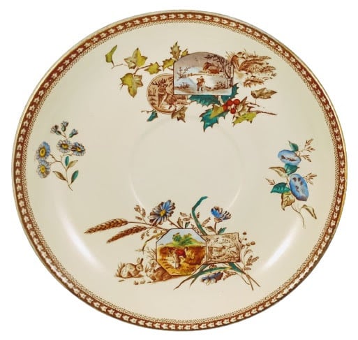 Mush cup saucer, 8.25 inches diameter. Brown transfer with polychrome clobbering. Printed maker's mark for J. F. Wileman. This pattern features four motifs placed evenly around the saucer. On the left is a sprig of daisies and on the right is a sprig of morning glories. At the bottom are two overlapping cartouches laid over daisies and wheat with two rabbits to the left. The upper octagonal cartouche features a vignette of a farmer reaping wheat with a sickle. The bottom rectangular cartouche features a small game bird in the brush. At the top of the saucer are another two overlapping cartouches laid over holly and ivy with two game birds to the right. The upper irregular cartouche features a vignette of a farm with the farmer and his dog crossing the snowy landscape with a staff. The bottom circular cartouche features a stag in the wild.