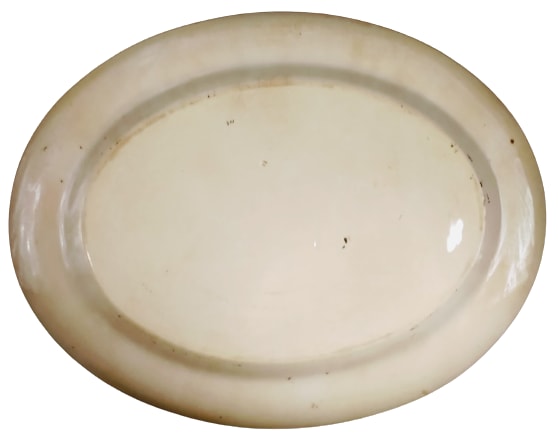 Platter, 16 x 13 inches. Brown transfer with polychrome clobbering. Impressed maker's mark for Thomas Furnival & Sons. This pattern features several motifs consisting of floral springs paired with decorated cartouches of different shapes. Most of the cartouches feature stylized floral and foliage patterns, but one fan-shaped cartouche features a scene of cranes standing in a marsh.