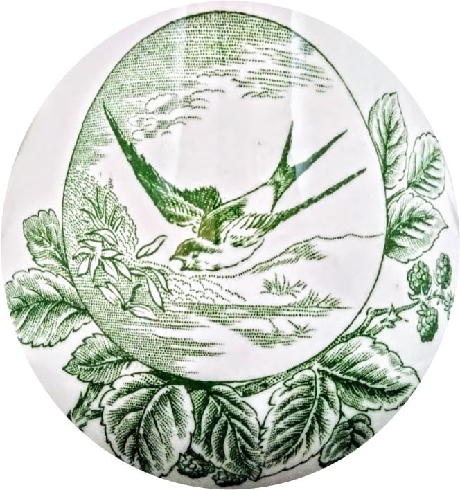 Teapot, 9.5 x 9 inches. Green transfer. Printed maker's mark for Baker & Co. This pattern features three motifs placed around the teapot. There is a sprig of morning glories on both the spout and the lid, and an ivy vine stretched horizontally across the spout right side of the body. On the spout left side of the body there is a sprig of blackberries with a superimposed circular cartouche with the image of a swallow in flight over a field with hills in the background.