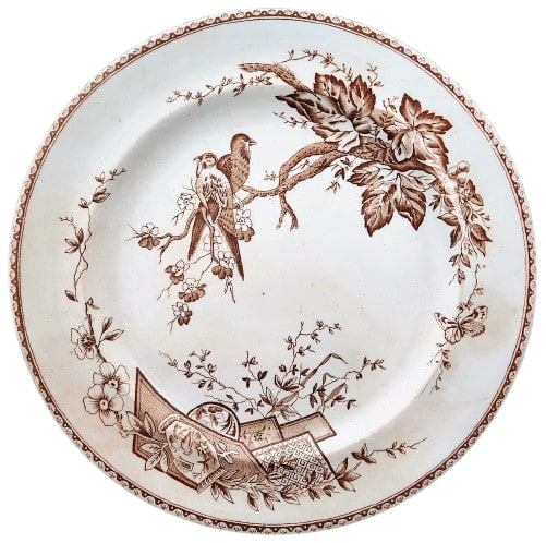 Plate, 9.375 inches diameter. Brown transfer. Printed maker's mark for Ralph Hammersley. The impressed "12/88" indicates a manufacture date of December 1888. This pattern features two birds perched on a flowering branch with a grapevine with fruit and leaves twined around it. In the lower right, a pastiche of ribbon cartouches contains another image of two birds, in addition to infilled geometric patterns. Flowers and leaves lay beneath the cartouches, while a butterfly floats off the right.