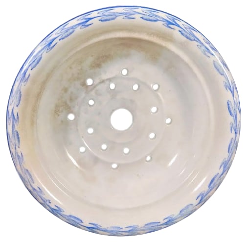 Soap dish, 5.75 x 5.75 x 4 inches. Blue transfer. Printed maker's mark for E. & C. Challinor. This botanical pattern feature waterlilies with orchids and foliage on the lid and a ring of orchids and foliage around the body. The border around the rim of the insert features a ring of cattails.