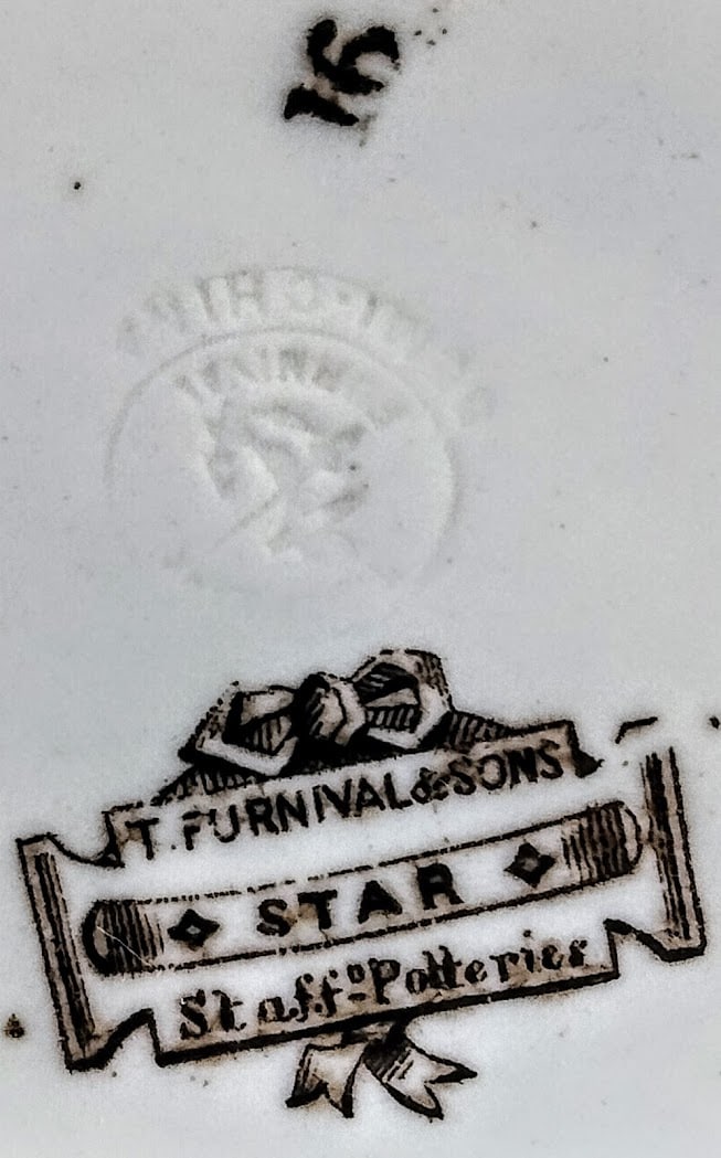 Following involvement in previous partnerships, from 1851 Jacob and Thomas Furnival became partners at J. & T. Furnival. As well as earthenware manufacturers, they were in business as Grinders of Potters’ Materials at Etruria Vale, in the borough of Hanley. In 1859 Jacob Furnival, Thomas Furnival, and Francis Joseph Emery applied for a patent for “Improvements in apparatus for supporting articles of china and earthenware in kilns and ovens.” In May 1864 the partnership between Jacob and Thomas Furnival was dissolved and the business was continued by Thomas Furnival. Around 1871, Thomas Furnival the younger joined the business which became Thomas Furnival and Son. In 1876, another son, Samuel Bourne Furnival joined the business, which became Thomas Furnival and Sons. Around 1883 the company found itself in financial difficulty with liabilities of £60,000 (around £5 million in 2020 terms). In 1884 there was a notice of “Liquidation by Agreement” which allowed the company to trade out of its difficulties. Thomas Furnival Sr. retired in 1890 and the business was continued by his sons Thomas, Samuel, and Arthur. The style of the business became Furnivals.