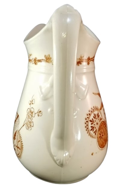 Jug, 8.5 inches tall. Brown transfer. No maker's mark, but this pattern is recorded as belonging to Henry Alcock & Co. The pattern consists of four cartouches, three round, and one square. The three round cartouches are infilled with various floral images, while the square one, with two corners clipped, is divided diagonally with a Greek key band. On either side of the band are simple floral images. Behind the cartouches are two stems of delicate flowers. The thin border at the neck of the jug is a simple vine with small buds.
