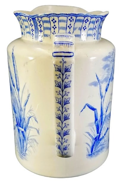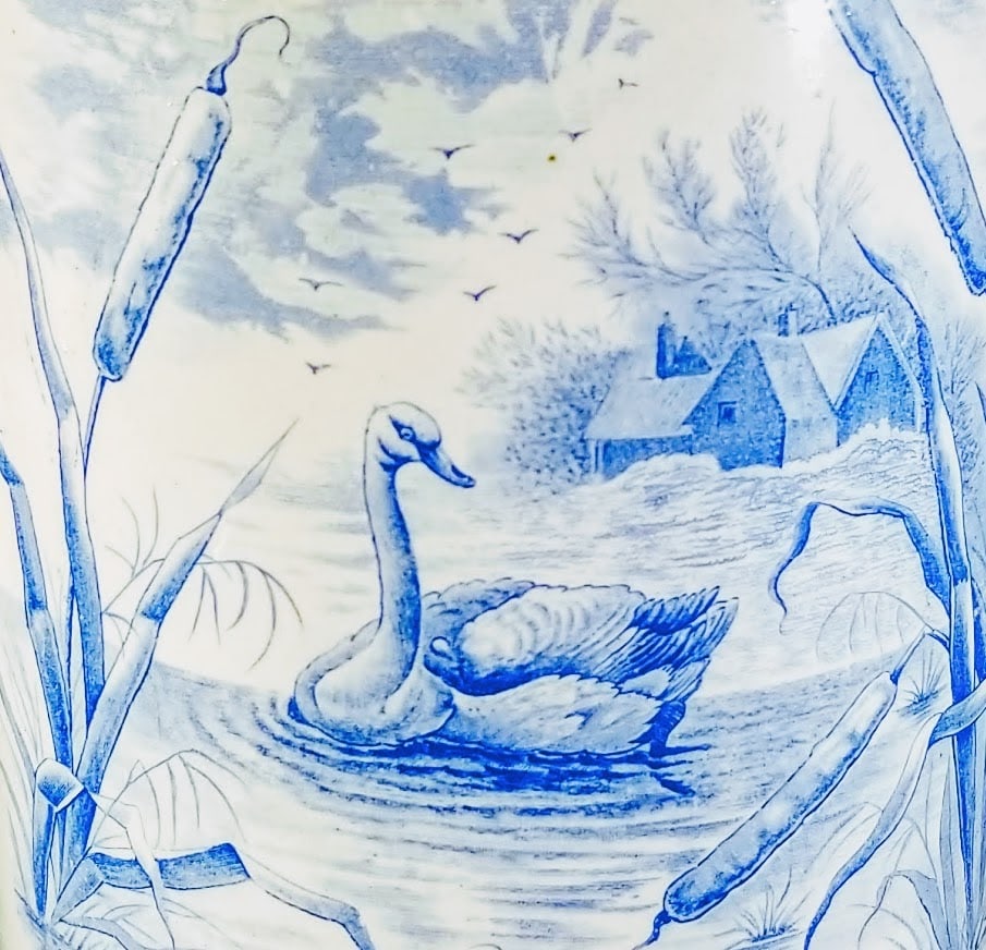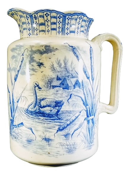 Pitcher, 10.5 inches tall. Blue transfer. Printed maker's mark for Whittaker & Co. As the pattern name suggests, this pattern features a swan in the water framed by cattails in the foreground. In the background is the shore with a cottage under cloudy skies with flying birds in the distance. This scene is repeated on the opposite side of the pitcher. The border consists of alternating vertical bands with horizontal stripes and circular quadruplets. The handle features line of stylized leaves and berries in clumps of three.