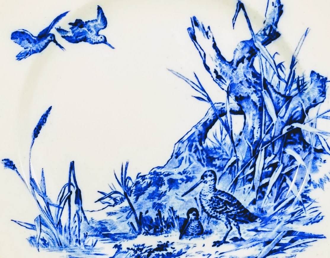Plate, 10.25 inches diameter. Blue transfer. Printed maker's mark for William Brownfield & Son. The registry diamond dates the registration of this pattern to 10 June 1875. This pattern is part of the "Sylvan" series, which features animals in natural settings. "The Haunt of the Snipe" features two snipes, one laying on the ground and the other standing to the right in a setting of grasses set against a ragged three stump. Two snipes are flying in the air in the upper left.