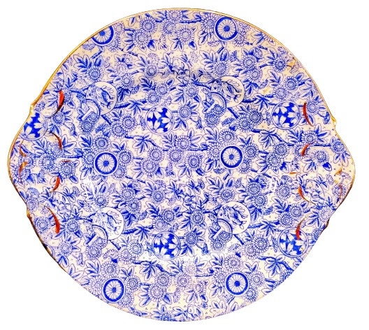 Serving plate, blue transfer. Printed maker's mark for Sampson Smith and pattern registration number for 1885. This lovely pattern features a sheet of stylized flowering branches beneath Japanese flower mon and Japanese fan cartouches depicting fish. The molded handles and border are gilded.