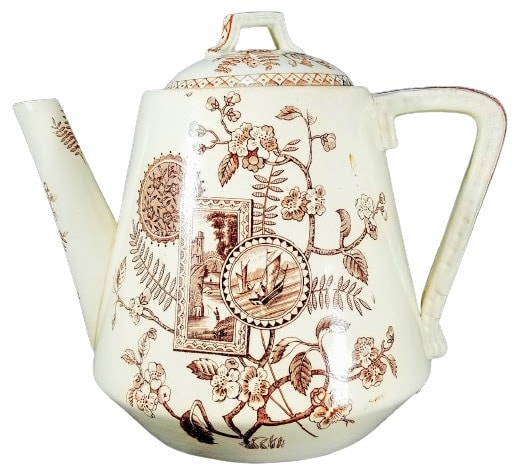 Teapot, 8 x 7 x 5.5 inches. Brown transfer. Printed maker's mark for Ford & Riley. The teapot has the same center design on both sides and the border on the rim of the lid is repeated on both handles (lid and teapot itself). The three cartouches (oval, rectangular and round) contain three different infills. The round cartouche shows two sailboats, while the rectangular cartouche portrays a man fishing in a river opposite a cliff with a castle on top. In the distance a man is crossing a bridge with one arch. Tall trees loom in the distance. The oval cartouche is infilled with small flowers and leaves. Behind the cartouches are flowering branches and ferns.
