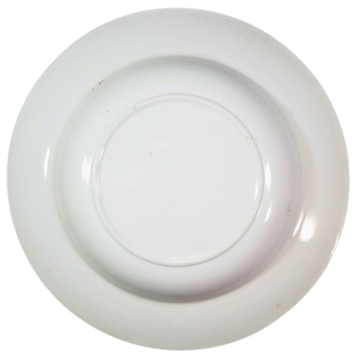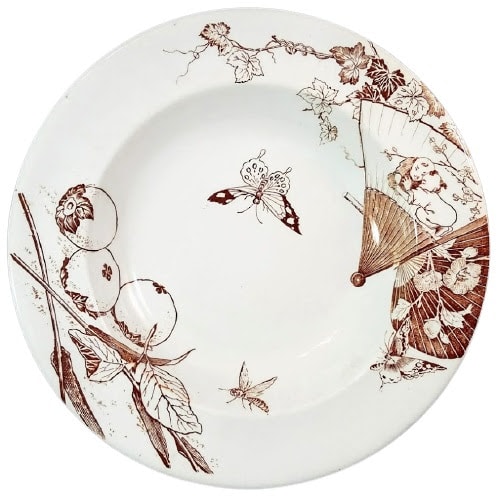 Soup plate, 9.5 inches diameter. Brown transfer. Maker is William Brownfield & Son. This pattern features a butterfly and wasp in flight in the well, bordered above and below by two separate motifs. The top motif consists of two overlapping Japanese fans with a butterfly to the right, superimposed above grape vines. The folding fan features an image of two Asian children, kneeling on the ground very closely together, with flowering prunus branches above. The uchiwa fan features an image of flowers and buds on leafy stems. The bottom motif consists of several persimmons laying on the ground with fallen leaves.