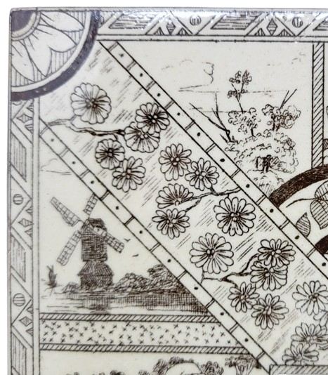 Tile, 6 x 6 inches. Brown transfer. Makers mark for Minton, Hollins & Co. This pattern, registered on 25 September 1880, is one in a series of 12 patterns with four scenes centered around a cartouche. This pattern features scenes of a kingfisher perched over water, a young girl sitting in a field, a landscape with a windmill, and flowering branches, divided by a diagonal band decorated with stylized flowers and a partial cartouche filled with stylized foliage. The border consists of a thin geometric band with a quarter roundel featuring a partial stylized flower in each corner.