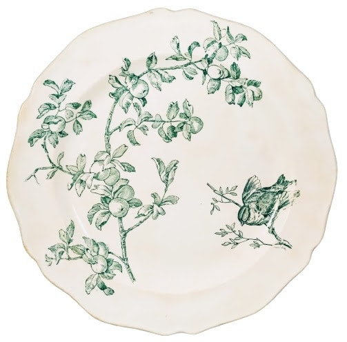 Plate, green transfer. Impressed maker's mark for Josiah Wedgwood. The impressed three-letter date code indicates a manufacture date of 1886. This pattern features a songbird perched on a twiggy branch to the right of a fruiting branch.