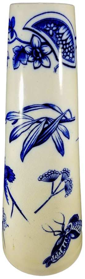 Vase, 10.25 inches tall. Blue transfer. Unknown maker. This pattern features a scroll cartouche depicting a heron in flight heading towards a pond with water lilies and cattails. The scroll is pierced by a thorny branch with blossoms. One bird has a ring in its mouth which is hanging from the thorny branch. Another bird flies above. A stylized butterfly and sprigs of flowers and foliage fill the remaining empty space.