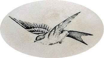 Bowl, 9.375 x 7.375 x 1.875 inches. Unknown maker. This simple Aesthetic pattern features a songbird in flight in the well with a sprig a morning glories tied with a ribbon above and a thorny blackberry branch with berries, flowers, and leaves below.