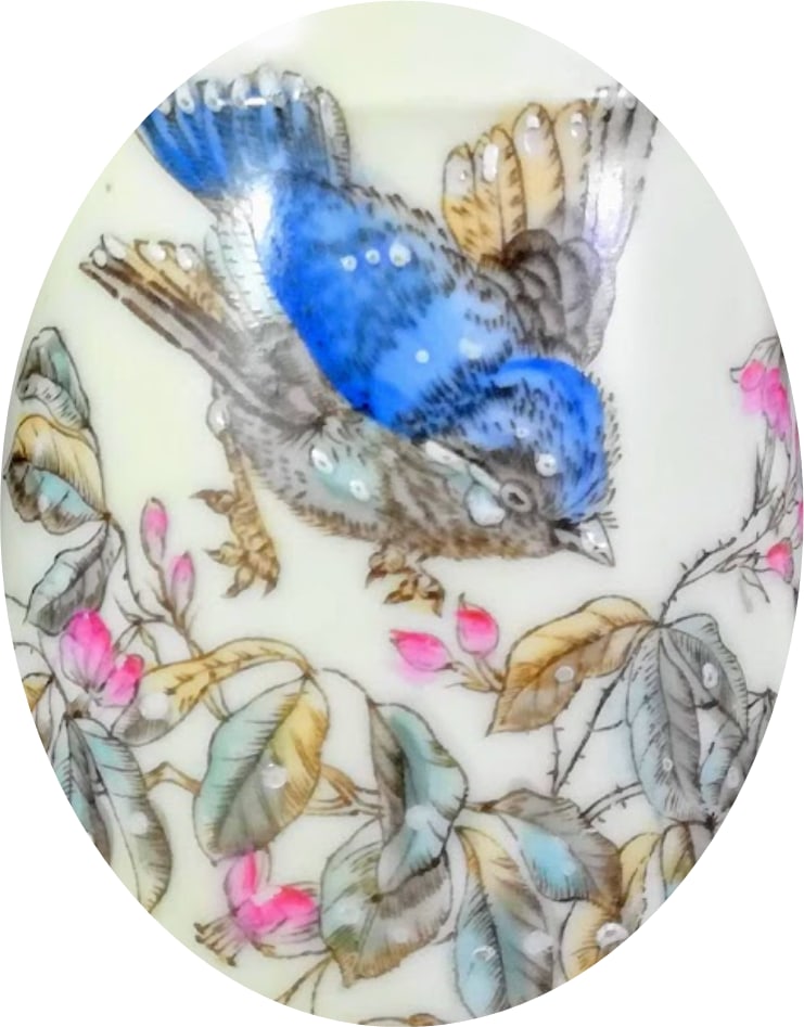 Pitcher, 5 inches tall. Brown transfer with polychrome clobbering and gilding. Unknown maker. This simple pattern features a bluebird with wings outstretched, about to land on a slender, thorny branch with smooth, lobed leaves and pink flowers with long stamens.
