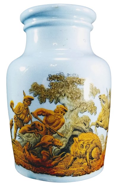Relish or mustard pot, 3.875 inches high. Pale blue earthenware with black and yellow transfer decoration. A "meat pot" was registered on 18 August 1871 by F. & R. Pratt & Co. A pot the same shape as seen here, with A Wild Boar Hunt pattern is illustrated in Griselda Lewis' "A Collector's History of English Pottery," 1999 (pg. 169). On pg. 171, a 4-inch jar is illustrated with the same two color design of a boar hunt. Other hunting scenes are shown decorated in the same way as well as the figure of Shakespeare seated. The bottle is seen here with the left end of the wraparound pattern and the right end. A panorama shows the complete pattern with the men and dogs all coming in to kill the boar, seen in the center, having come out of the hollow tree in the back.