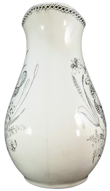 Pitcher, 7.75 inches tall. Black transfer. Unknown maker. This pattern features identical images on both sides of the pitcher body: four butterflies in flight among a clump of wildflowers and grasses. The border consists of a twisted rope around the rim and along the handle.