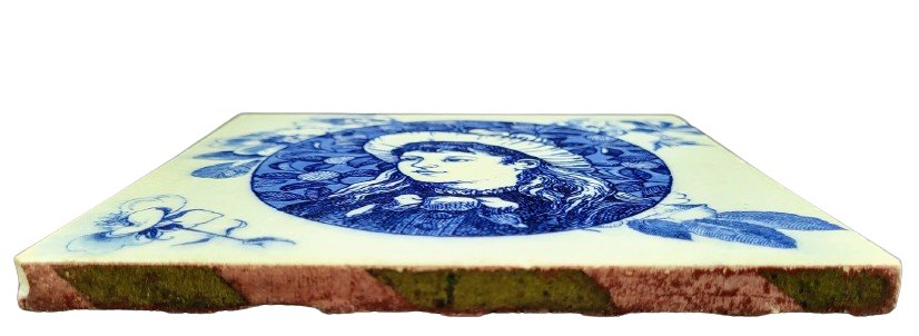 Tile, 6 x 6 inches. Blue transfer. Maker's mark for Josiah Wedgwood. In c. 1880-1883, Thomas Allen designed a series of images for tiles and dinnerware for Josiah Wedgwood. Some of the designs were included as a series of 7 subjects intended for tiles known as "Hats." Each illustrated a child in a different hat, contained within an oval, oblong, or lemon-shape, and set against a background of fruit, flower sprigs, and sprays. Thomas Allen also designed a series of 4 subjects known as "Cameo Heads." No known source lists all eleven designs, but it seems some at least were interchangeable. This cameo head appears in an oval filled with citrus fruits and leaves and consists of a young girl in profile with hair down wearing a hat. The oval is framed by sprigs of flowers.