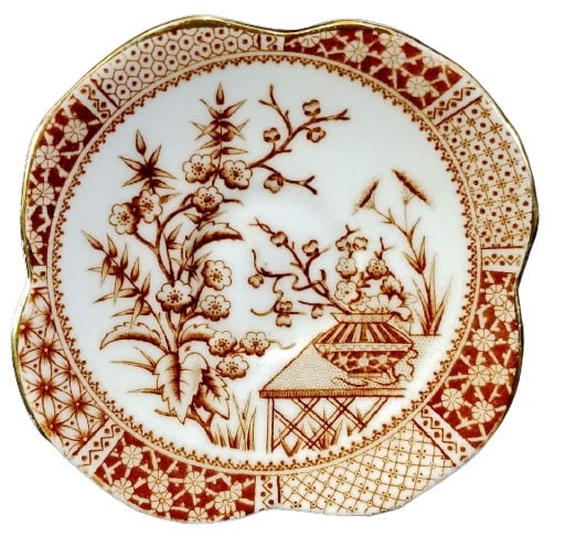 Butter pat. Red transfer with gilding. Unknown maker. The Rd. No. indicates a pattern registration date of 1889. This unnamed pattern features a central image of a squat, Oriental vase filled with prunus blossoms resting on a low table. To the left and top are more blooming prunus branches, bamboo, and additional flowers. The border consists of panels alternating between stylized floral and geometric patterns. A simple gilded line decorates the rim.