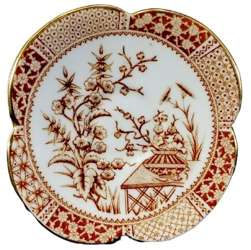 Butter pat. Red transfer with gilding. Unknown maker. The Rd. No. indicates a pattern registration date of 1889. This unnamed pattern features a central image of a squat, Oriental vase filled with prunus blossoms resting on a low table. To the left and top are more blooming prunus branches, bamboo, and additional flowers. The border consists of panels alternating between stylized floral and geometric patterns. A simple gilded line decorates the rim.