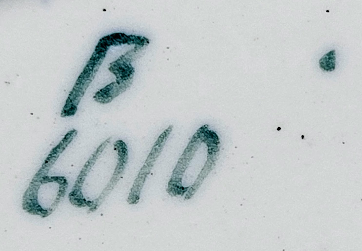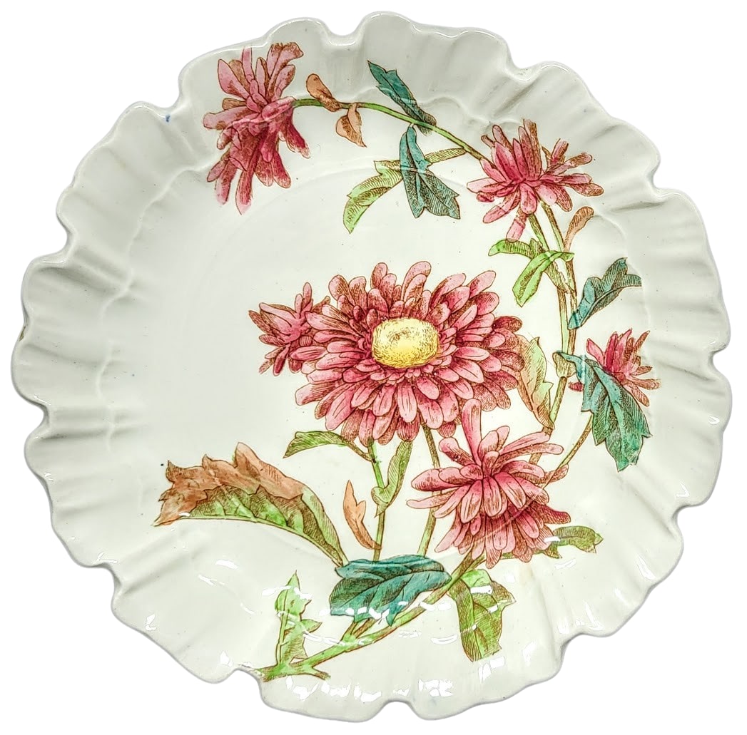Ruffled plate, 9 inches diameter. Brown transfer with polychrome clobbering. Impressed maker's mark for Brown-Westhead, Moore & Co. Green painted pattern number "B6010." This simple floral pattern features a spray of chrysanthemums on a leafy steam arching around the well of the plate.