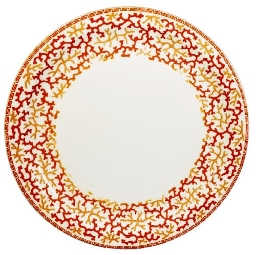 Plate, 6.5 inches diameter. Hand-painted in red-orange. Printed maker's mark for Brown-Westhead, Moore & Co. This pattern features a wide border of coral with a narrow meander pattern around the rim.