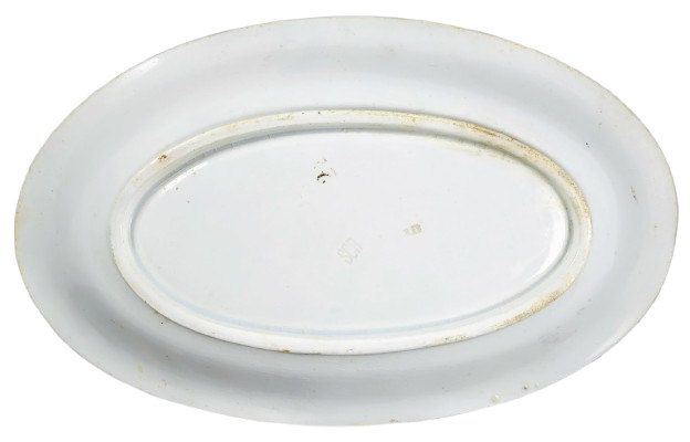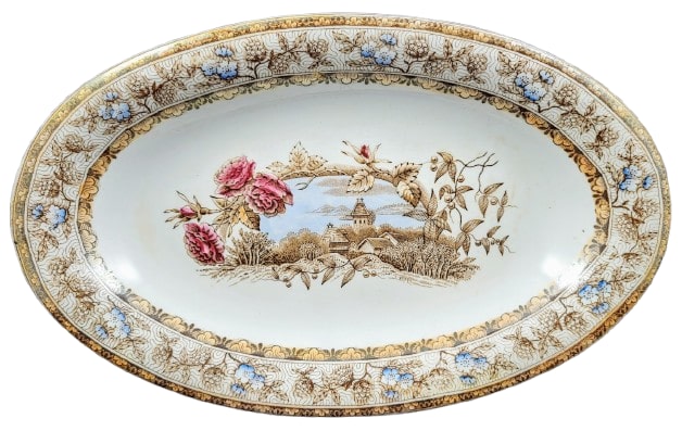 Bowl, 10 x 6.25 x 1.5 inches. Brown transfer with polychrome clobbering. The maker is unknown, but the impressed "SCR" and "bleu" suggests a French maker. This pattern features a central oval vignette of a country village composed of wooden buildings, including a church, nestled in a forest with a lake and hills in the background. The vignette is bordered on top by blooming roses and to the right and bottom by vines of leaves and berries. The border consists of a vermicelli band filled with repeated blackberry and flower motifs and bordered on top and bottom by alternating, stylized three-petaled flowers and leaves.