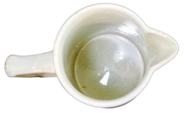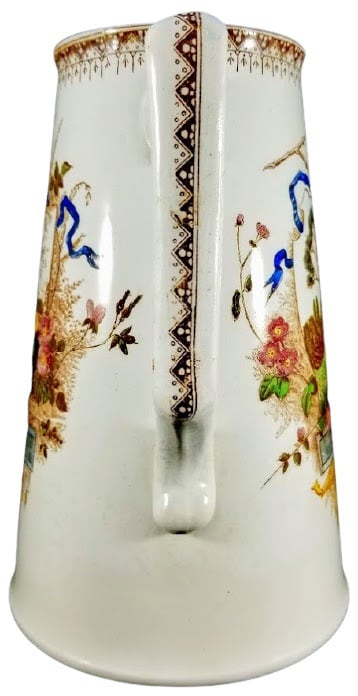 Pitcher, 8 inches tall. Brown transfer with polychrome clobbering. Unknown maker. One side of the pitcher shows a country scene inside a square cartouche including trees, hills and a cottage. Surrounding this cartouche are wild grasses and branches with small pink flowers with yellow centers and green leaves. A blue ribbon passes through a hole at the top of the cartouche which appears to rest on a gray stone plaque and classical golden shell with Greek key design beneath. Interestingly, the opposite side of the jug shows another country scene inside an irregular or broken cartouche with similar surrounding materials. A blue ribbon is interwoven with the branches above the cartouche and a golden scroll appears underneath. The front of the pitcher shows a small vignette of a trellis with trailing plants found under the spout. The border is a geometric design dominated by rows of alternating light and dark triangles with dots inside, along with rows of smaller triangles, lines and arrows. The same main triangle design is found on the handle.