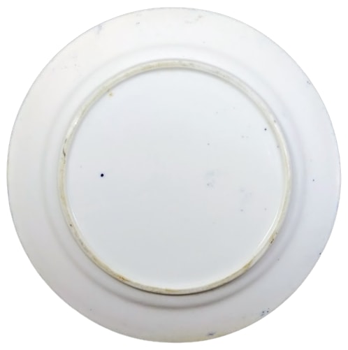 Child's plate, 6.125 inches diameter (15.6cm). Unknown maker. This pattern consists of a Japanese uchiwa fan containing an image of a resting doe and her standing fawn at the edge of water with a steep hill and tree in the background. The fan is superimposed over blades and stalks of seeded grass.