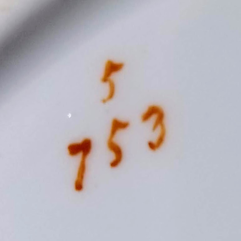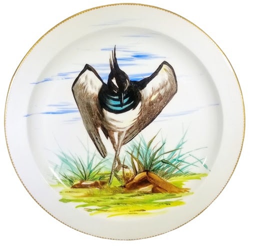 Plate, 9 inches diameter. Hand-painted with gilding. Impressed maker's mark for Bodley could refer to any of the Bodley firms between 1862 and 1892. Red painted pattern number 5/753. This cabinet plate features a lapwing with wings partially unfurled, looking down at the ground. The border consists of a thin, scalloped, gilded band.