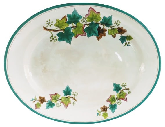 Platter, 18 x 14.5 inches. Black transfer with polychrome clobbering. Printed maker's mark for Thomas Booth & Sons of the New Hall Pottery in Hanley, Staffordshire, England. This simple pattern features three branches of English ivy placed opposite each other on two sides and a simple double line in green and brown.