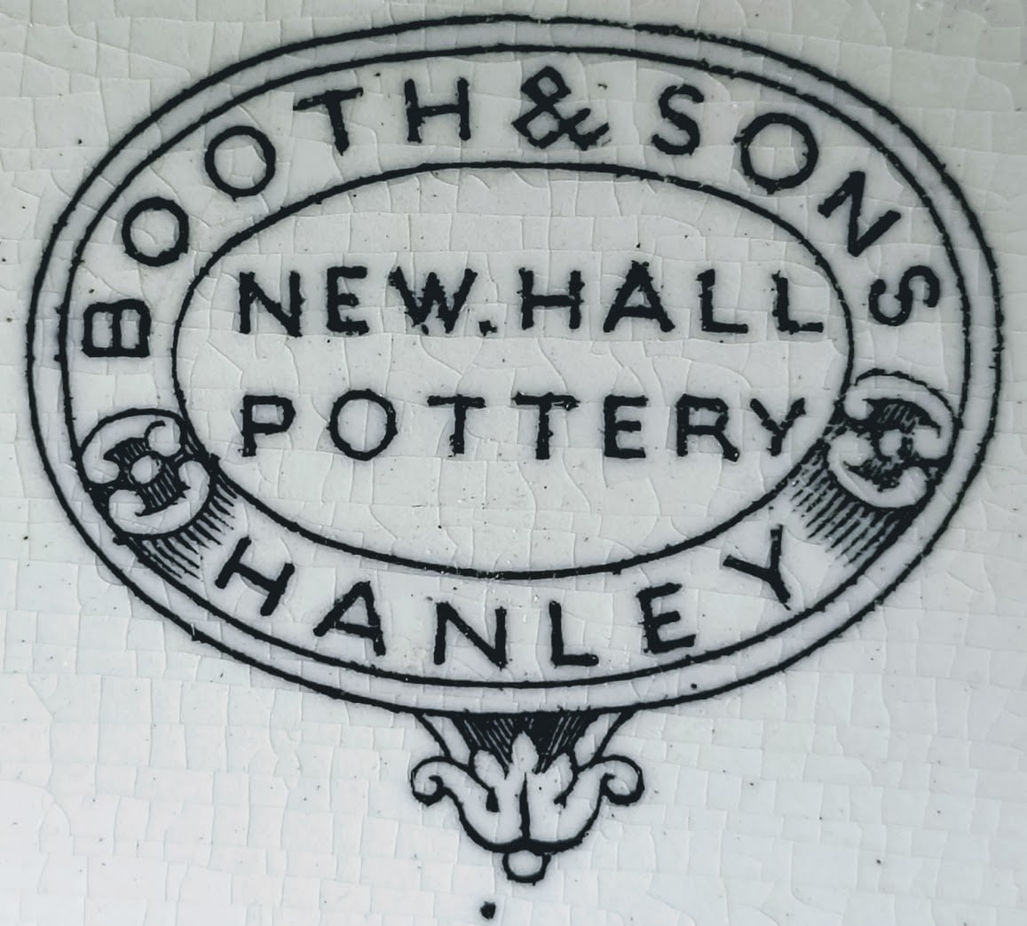 In the 1871 census Thomas was listed as an "earthenware manufacturer." Around 1872 the business relocated to the New Hall Works and Thomas took his two sons, Walter and Henry, into partnership. From May 1872 to March 1875 there were at least 5 earthenware design registrations made by Thomas Booth & Sons, New Hall Works, Hanley. In September 1874 Thomas Booth retired from the partnership with his sons. The notice records that they operated as "Earthenware Manufacturers and Metal Mounters" in Hanley and "at Brownfields, near Longton... as Colliery Proprietors." Walter and Henry continued, retaining the name Thomas Booth & Sons. In April 1877 the business was liquidated and the first notice issued for a meeting of creditors to be held on the 16th of April 1877, "instituted by Walter Booth and Henry Booth, both of 76, High Street, Hanley.. carrying on business as Manufacturers of Earthenware, at the New Hall Works, Hanley.. and as Colliery Proprietors, at the Brownfields Colliery, Longton.." NOTE: There is no known relation between this Thomas Booth & Sons and Thomas Booth & Son of Burslem & Tunstall.