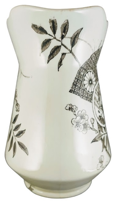 Pitcher, 6.5 inches tall. Brown transfer. Printed maker's mark for Green & Clay. This small pitcher has three overlapping fans with different designs, backed by sprays of flowers and leaves. The round fan has three butterflies pictured while the other two have either flowers or geometric designs. The reverse side of the pitcher features only flowers and leaves.