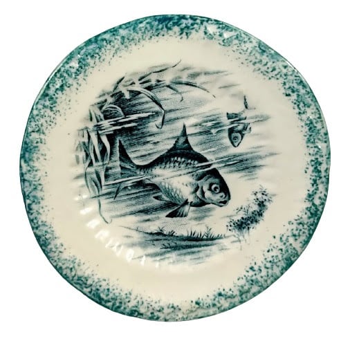 Butter pat, 4 inches diameter. Blue transfer. Printed maker's mark for the Empire Porcelain Co. of the Empire Works in Hanley, Staffordshire, England. This pattern features an underwater scene of two fish swimming with grasses emerging from underneath the water and arching above.