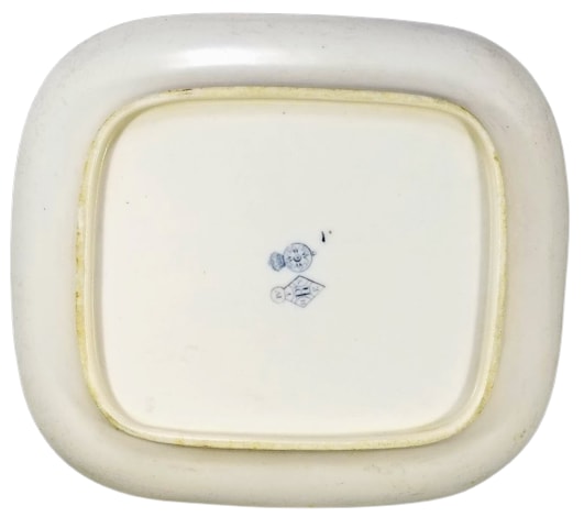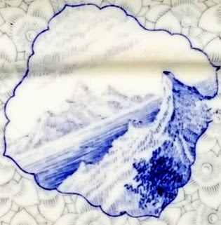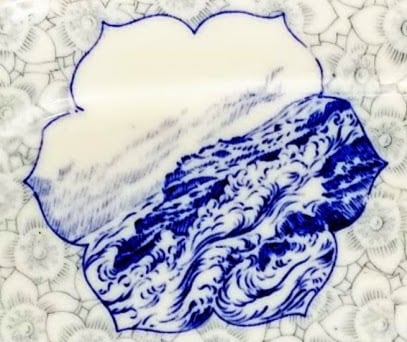 Platter, 8 x7.125 inches. Blue transfer. Printed maker's mark for the Royal Worcester Porcelain Co. The letter 'U' under the mark dates production of the pattern to 1883. The pattern was registered May 7, 1879 according to the diamond mark. Beneath the four cartouches in deep blue is a sheet pattern of gray blossoms. The pattern consists of four cartouches, shaped differently. Each cartouche contains an image which shows water. Two contain boats, another mountains and water, and finally, simply, water and sky.