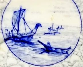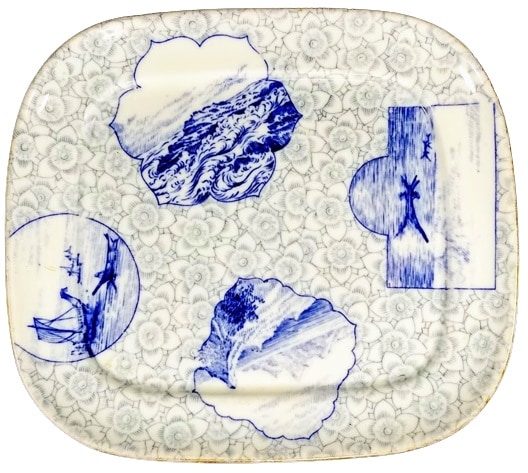 Platter, 8 x7.125 inches. Blue transfer. Printed maker's mark for the Royal Worcester Porcelain Co. The letter 'U' under the mark dates production of the pattern to 1883. The pattern was registered May 7, 1879 according to the diamond mark. Beneath the four cartouches in deep blue is a sheet pattern of gray blossoms. The pattern consists of four cartouches, shaped differently. Each cartouche contains an image which shows water. Two contain boats, another mountains and water, and finally, simply, water and sky.