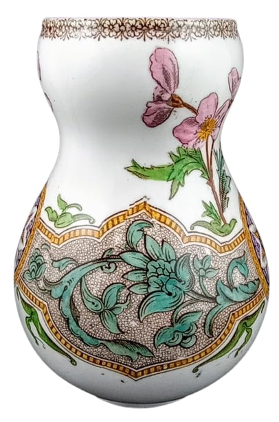 Vase, 6 inches tall. Brown transfer with polychrome clobbering. Unknown maker. This pattern consists of a wide, irregularly-shaped band stretching around the body of the vase and punctuated on two sides by a circular medallion filled with a large, stylized flowerhead. The band is filled with small circles and is overlaid by large, stylized flowers and foliage. Behind and above and below the decorative band, are blooming wildflowers and leaves. The narrow border around the rim consists of repeated flowerheads.