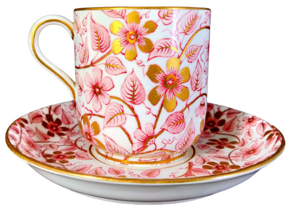Teacup (3.5 x 3 inches) and saucer (5.25 inches diameter). Printed maker's mark for Brown-Westhead, Moore & Co. and a retailer mark for Burley & Tyrrell, a Chicago china retailer who operated between 1871 and 1883. This delicate, all-over pattern features curving stems with leaves and flowers in pink and accented with gilding. The border consists of a simple gilded line.