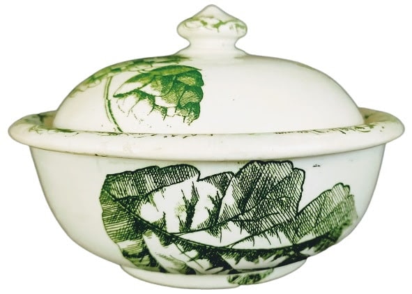 Soap dish, 5 x 3.5 inches. Green transfer. Printed maker's mark for Stonier, Hollinshead & Oliver. This unnamed pattern features a collection of unconnected botanical images. The body of the dish depicts two oak leaves and a bee in flight. The lid features a sprig of hops and a twig of acorns. The border around the insert rim and on the knob handle consists of two intertwined vines with a smaller, more delicate leafy vine winding around them.