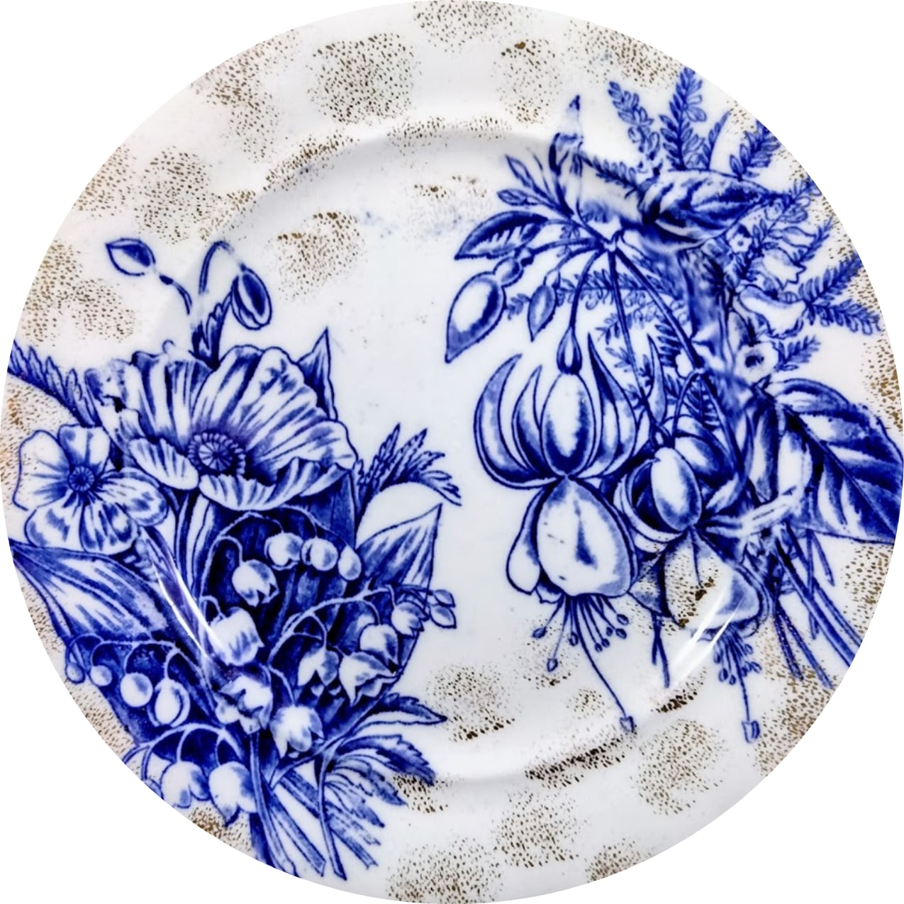 Plate, 7.25 inches diameter. Printed maker's mark for F. Winkle & Co. This pattern features two bunches of flowers opposite each other. The left features poppies and lily-of-the-valley and the right features fuchsias and small flowers with feathery-shaped leaves. The face of the plate is liberally sponged with gilding and the border consists of a simple gilded line.